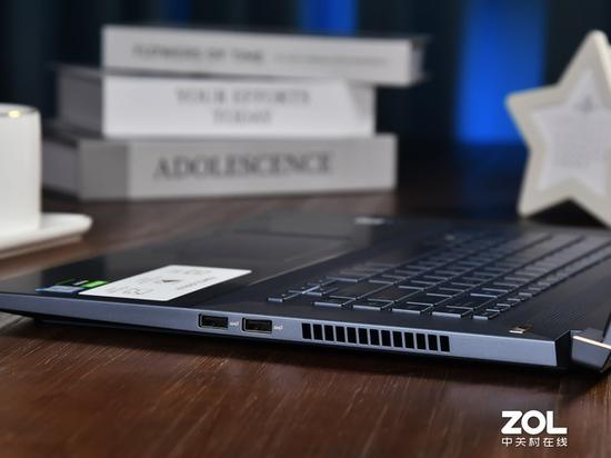 机身右侧配有两个USB 3.1 GEN 2接口,虽然它们的速度没有雷电3快,但是标准的TYPE-A,以及10Gbps的传输速度对于现在的用户而言无疑是既方便又实用。