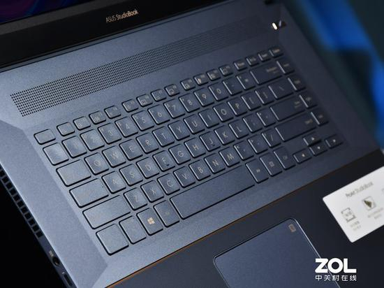 此外可以看到,ProArt Q17整个C面采用了两种风格的面板打造,键盘周围采用了金属面板喷砂工艺,下方的腕托区域采用了塑料材质、并在表面设计了斜向纹理,既美观的同时又能够增强手腕部分的摩擦力和舒适度,使整体的使用体验更加舒适。