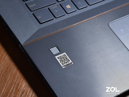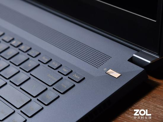 另外,在C面左上角设计有镀铬表面的矩形电源键,电源键左侧为扬声单元区域,左侧腕托左上角配置了一枚指纹识别器。