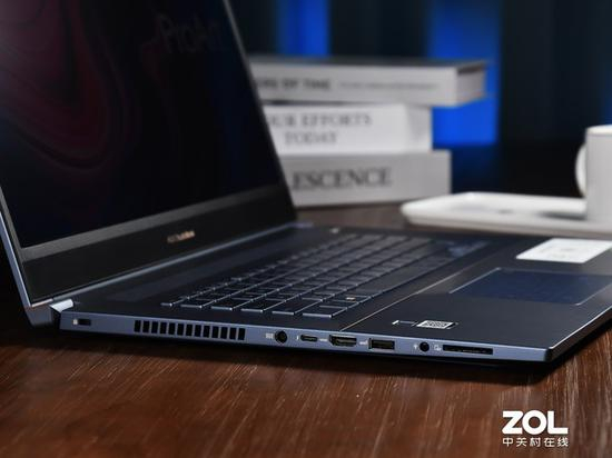 作为大尺寸产品,同时又是设计师定位的产品,在接口扩展性上自然要有足够可靠的表现。机身左侧配有安全锁孔、电源插孔、满速雷电3接口、标准HDMI接口、USB 3.1 GEN 2接口、3.5mm耳麦插孔以及标准的SD 4.0/UHS II读卡器。