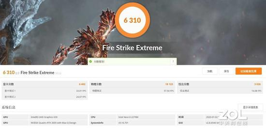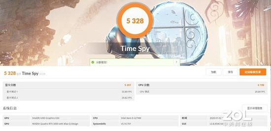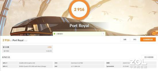 使用3DMark软件测试,我们可以看到其Time Spy图形性能5201分;FireStrike Extreme图形性能6402分;Port Royal光追图形性能2916分。基准性能要比GeForce RTX 2060低一些,不过Quadro显卡主要用于专业领域,这里的分数大家只作为参考看看就可以了,因为它的价值并不在这里。