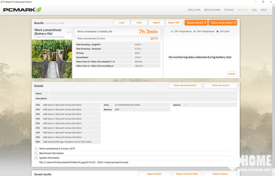 续航方面,我们采用PCMark 8内置的续航测试,在电量为100%时开始进行,电池的性能方案我们选择[更长的续航],屏幕亮度60%,保持WiFi与蓝牙开启。我们模拟最常见的Work conventional使用场景,最终测试成绩为7h3min,剩余电量为20%,这个成绩还是相当不错的。满电情况下,微软Surface Laptop 3大概可以连续使用近9个小时,如果配合节能模式,续航时间还可以有所提升。