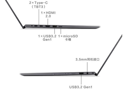 配置方面,宏碁 Spin5 搭载了 10 代酷睿处理器,集成 Iris Plus 显卡,最高配备 16GB LPDDR4X 3200 内存和 1TB SSD。接口如下图所示: