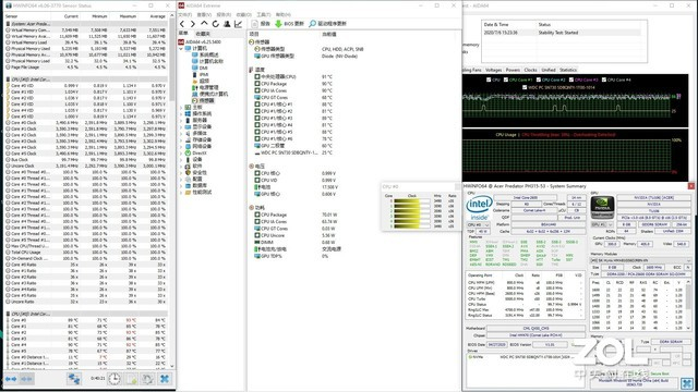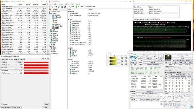 双烤测试中,在FPU的基础上加入FurMark甜甜圈,选择1920*1080分辨率与8xMSAA,30分钟后,CPU全核频率3.2Ghz,温度92度,功耗52W;GPU频率1545Mhz,温度76度,功耗88W。WASD游戏区域及掌托位置无明显热量。