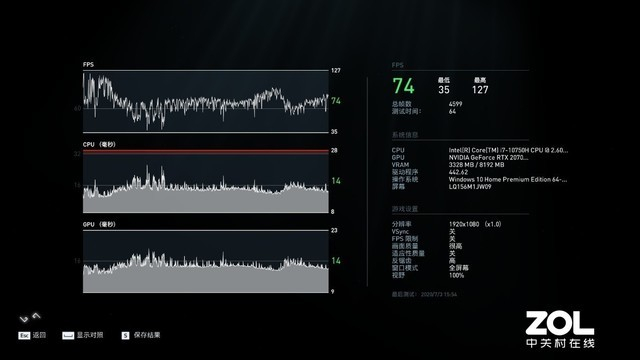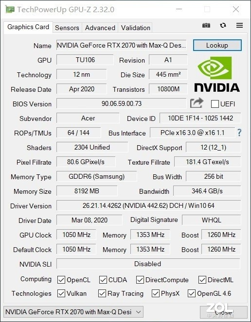 GPU方面我拿到的机器搭载了RTX2070 Max-Q,8GBGDDR6显存,拥有2304个处理器,显存位宽256bit,Boost频率1260Mhz,支持实时光线追踪与DLSS2.0。