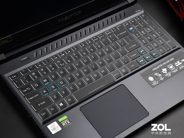 在操控区域,键盘键程适中,全尺寸键盘布局,方向键为正常大小。WASD、PredatorSence快捷键以及方向键的键帽做了高亮处理,尤其在开启背光后,格外显眼。整个键盘分为四个独立区域,每个区域的RGB背光可以单独进行调节。触摸板手感很细腻,但触摸板的位置有点过于靠左了,激烈操作时容易误触,在游戏时还是Fn+F7关闭掉触摸板比较好。