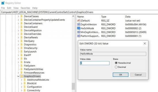 5。 找到名为“HwSchMode”的 DWORD 选项。该选项中的值 2 意味着启用,1 意味着关闭
