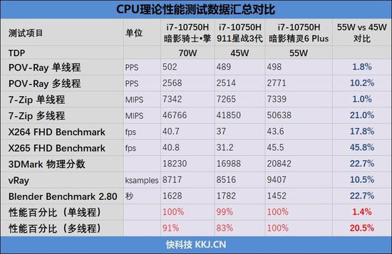 结果令人吃惊,暗影精灵6 Plus所搭载的i7-10750H TDP开放到55W,相比911星战3代45W的TDP高了10W,而多线程性能却增加了足足20.5%,十代酷睿的潜力被彻底释放,只不过单线程性能增加有限,只有大约1%,显然已经达到了极限。
