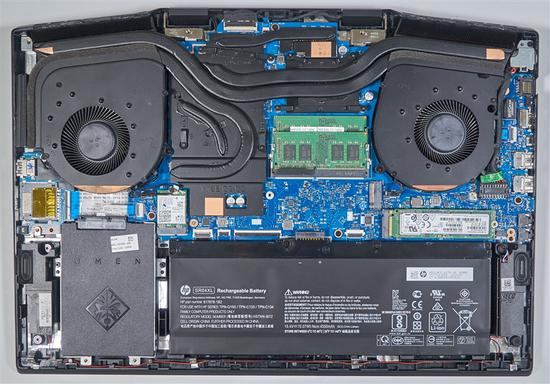 暗影精灵6的内部构造,散热系统是双风扇、三热管与三出风口设计,热管的直径与厚度都要大于普通的8mm热管。