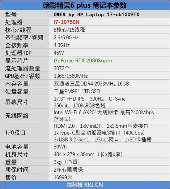 惠普暗影精灵6 Plus笔记本参数如下: