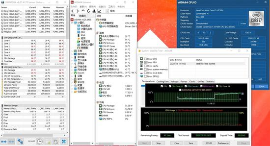使用AIDA64 FPU进行了5分钟的烤机,i7-10750H的功耗稳定在55W,温度在95度左右。