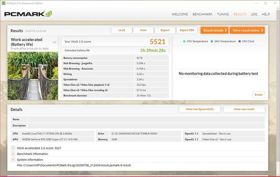 暗影精灵6 Plus搭载了一块容量为70Wh的锂聚合物电池,这个容量对于游戏本来说不算大。我们用PCMark8来实际测试一下办公续航。测试时选择性能模式、关闭所有其他进程,关闭网络连接,屏幕亮度调为50%。