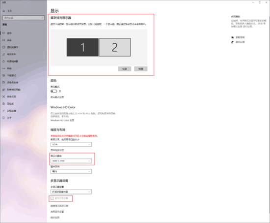 正确连接显示器之后,在系统显示设置中,将俩台显示器设置到正确的屏幕分辨率,然后根据显示器的具体摆放设置主副显示器。