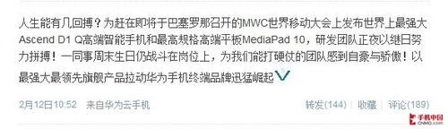 从华为高级副总裁余承东的微博上我们可以看到,华为已经蓄势待发。相信在这次MWC大会国内厂商必将带给我们惊喜。