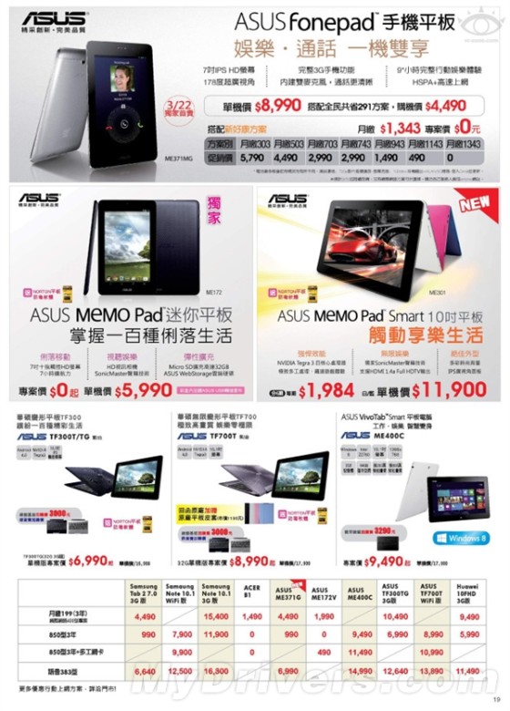 据台媒消息,FonePad将会在3月22日在台湾地区开卖,而官方建议零售价为8990元新台币,折合人民币约1879元,比美国版价格(约合人民币1560元)略贵一些。