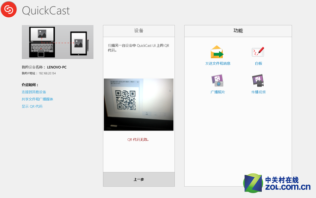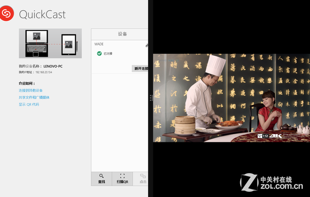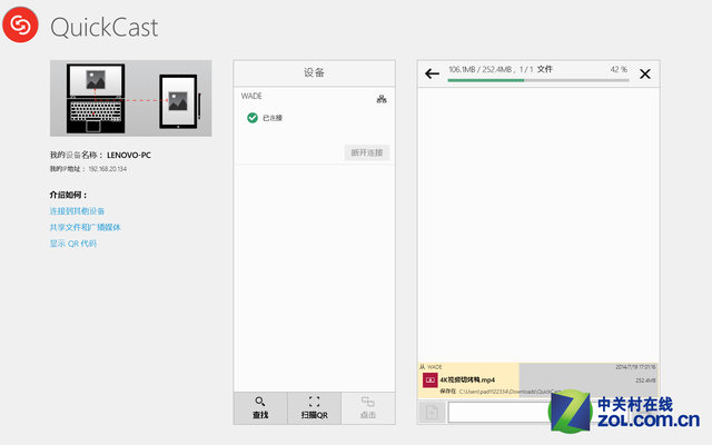 经过实测,QuickCast的链接十分方便,仅仅需要一方扫描另一方的二维码即可瞬间连接成功。链接成功后可以选择传输文件中的照片视频或者进行预览播放,文件的传输速度大约是5MB/s,传输一般大小的文件十分快捷方便,免去了没有优盘的困扰。