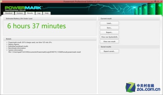 电源默认为平衡模式,经过一段时间的测试后,最终得到6小时37分的测试成绩,这样的续航成绩在同类型产品中的表现比较处于较出色水准。当然实际应用中 会与理论测试有一定的差异,具体使用时间还要根据用户的使用情况来做判断。(注:图中28%代表测试使用量,由于测试时间比较紧张,因此最终成绩属于估算 值,存在一定误差)