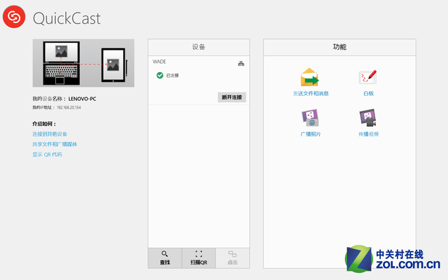 QuickCast是专门针对ThinkPad系列产品直接传输文件涉及的应用程序,借助Lenovo QuickCast,可在设备间轻松共享内容, 扩展用户的Lenovo体验。可以快速与好友、家人和同事分享您的音乐、照片、视频和文档。有了Lenovo QuickCast,可以更轻松更快速地进 行沟通、共享和协作,省去了连接设备和内容的麻烦。
