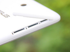 华硕Fonepad 7侧面为弧形,银白色仿金属边条增加一丝灵动的,不过弧形边框导致插耳机和数据线时部分会露在外面,机身厚度为9.8毫米,重量为299克,略显厚重。双 SIM卡槽、Micro SD卡槽在机身左侧,两个SIM卡槽都支持GSM/WCDMA网络,适合拥有多个手机号的朋友使用。