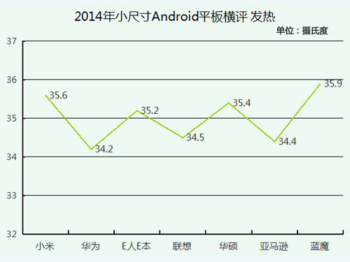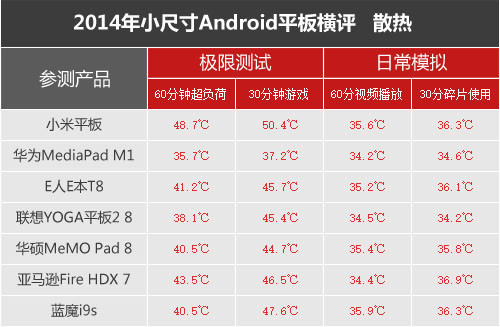 发热控制最好的是华为MediaPad M1,最高温度仅37.2摄氏度,发热少意味着功耗低,看来华为M1的续航一定很给力。联想YOGA平板2 8、华硕MeMO Pad 8、蓝魔i9s和表现接近,在接受范围内。