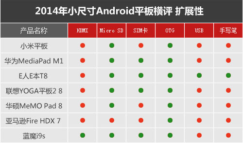 扩展性方面,唯有亚马逊Kindle Fire HDX 7不支持存储扩展。蓝魔i9s有HDMI接口,方便外接显示器。E人E本T8独有标准USB接口,可以直接用U盘交换数据,十分方便。E人E本T8还有一 只1024级压感电磁笔,是E本称霸商务平板市场的有力武器。