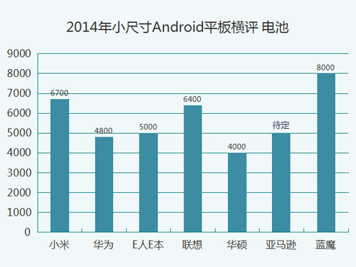 电池容量方面,蓝魔i9s采用8000毫安时超大容量电池,小米平板电池容量6700毫安,不过续航表现却一般。联 想YOGA平板2 8采用6400毫安时电池,官方宣称续航可达18小时,华为MediaPad M1电池容量4800毫安时,官方极力宣传低功耗长续航。华硕MeMO Pad 8电池容量最低,亚马逊Fire HDX 7没有标明电池容量,只宣传续航可达10小时以上。