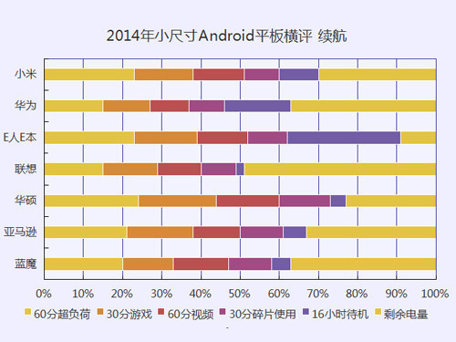 小米平板是性能怪兽,同时也是耗电能手,最终仅剩余30%的电量。亚马逊Kindle Fire HDX 7的表现与小米平板差不多。华硕MeMO Pad 8电池容量最小,最后剩余23%的电量,看来功耗控制也比小米平板强。