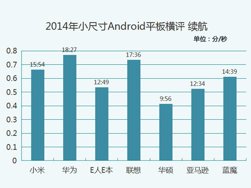 实际测试结果显示,电池容量与续航时间并不成正比,还要看功耗控制能力。下表为正常使用消耗4%电量所需时间,华为MediaPad M1电池容量仅4800毫安时,却用时18分27秒。拥有5000毫安时电池的E人E本T8仅用时12分49秒。