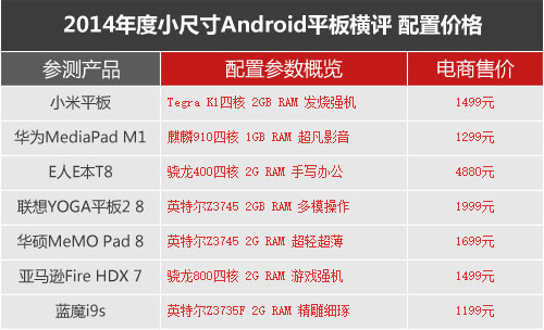 首先为大家简单介绍参与横评的七款今年备受瞩目的小尺寸Android平板,分别为小米平板、华为MediaPad M1、E人E本T8、联想YOGA平板2 8、华硕MeMO Pad 8 ME581C、亚马逊Kindle Fire HDX 7、蓝魔i9s,接下来了解七款平板的给力之处。