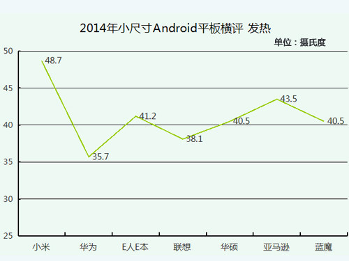 从发热曲线来看,小米平板性能最强劲,发热也很暴力,最高温度高达50.4摄氏度,视频播放时温度35摄氏度左右,还可以接受。亚马逊Kindle Fire HDX 7的发热也很严重,看来性能和发热成正比。