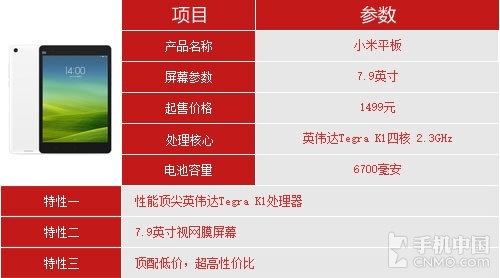小米平板是一款发烧神器,采用7.9英寸视网膜屏,搭载Tegra K1处理器,四个2.2GHz A15核心和一个A15省电核心架构。同时配备192核GPU,图形处理性能是苹果A7的2.3倍前,内置2GB运行内存及6700毫安时大电池,最低售 价仅1499元,大型3D游戏完全不在话下。