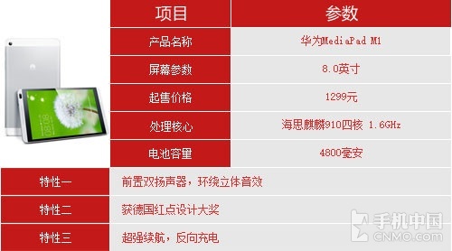 华为MediaPad M1市场定位很清晰,不去跟小米拼性价比,采用双前置立体环绕音响,主打娱乐影音体验,观影体验十分不错。华为M1配置足够用,搭载1.6GHz的Kirin 910四核处理器,1GB运行内存,8GB存储空间,售价1299元。