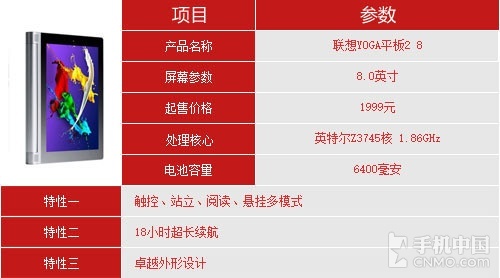 YOGA平板2 8是联想年度旗舰,采用英寸全高清幕,OGS全贴合工艺,同时搭载64位英特尔Z3745四核处理器,最高可睿频至1.86GHz,配备2GB运行内存, 性能够用。联想YOGA平板2在站立、阅读、触控的基础上增加悬挂模式,适用更多的使用场景。联想YOGA平板2 8配备6400毫安时电池,续航能力很少有平板敢与之比肩。