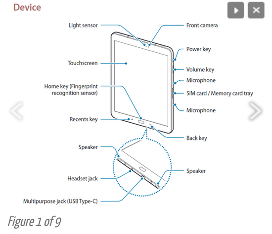 用户手册显示,Galaxy Tab S3在底部有两个扬声器,在顶部有两个扬声器,这使得扬声器的总数为4个,这将提升平板电脑音质。Galaxy Tab S3提供USB Type-C接口,出厂预装Android 7.0 Nougat。手册还显示新平板电脑上的所有键和端口,以及麦克风,SIM卡,Home按钮上的指纹传感器以及侧面的电源键。