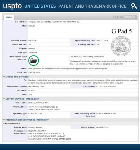 2019 年 9 月 17 日,LG 电子向美国专利商标局(USPTO)申请了 G Pad 5 商标。同时,我们也在欧盟知识产权局(EUIPO)的数据库中见到了它的身影。