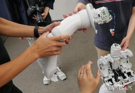Pepper拆下两条胳膊,看上去分量不轻,外形设计上和传统机械手臂也有不同。