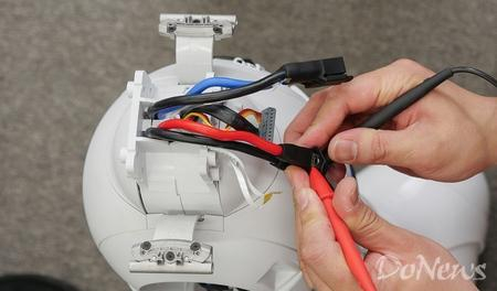风扇下方有一块电路板,主要负责电源管理分配。在机身后背上侧的红色按钮是紧急制动按钮。