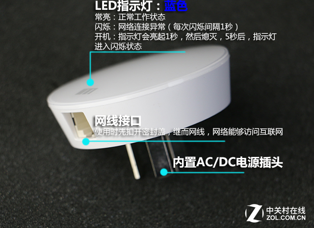 魅族路由器设计小巧、精美,采用电源、天线一体化式设计,让产品便携性更高,样子也更讨用户喜欢。在插孔与按键方面也非常简约,仅有1个网络接口、一个WPS按键及一个显示灯,在对该路由设备正式评测前,我们还得重新认识下魅族这款无线路由器。