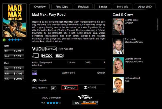 3、Vudu。近一年来上映的电影片源较多,像《星际迷航3》、《魔兽》、《疯狂的麦克斯:狂暴之路》等,目前为止Vudu只提供Dolby Vision电影,所以只有在支持Dolby Vision的设备上才能观看(LG、TCL、创维等品牌的旗舰电视都支持了这一标准)。