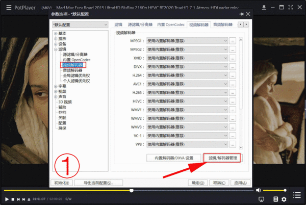 用Potplayer任意打开一个HDR视频,进入选项设置,在视频解码器中添加滤镜,选择系统滤镜,点选“madVR”(上图为具体操作流程)。这样播放器就成功添加了madVR滤镜。
