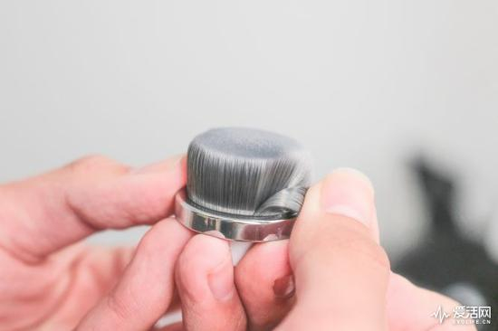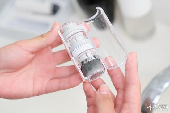 之后我们又尝试了软毛刷头,虽然与细绒刷头的刷毛直径均为0.075mm,但软毛刷头的刷毛质感明显要比细绒刷头刷毛稍硬一些,同时在束状排列下,这样的刷头可以更好的清除死皮以及面部缝隙中的油脂。