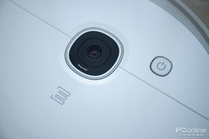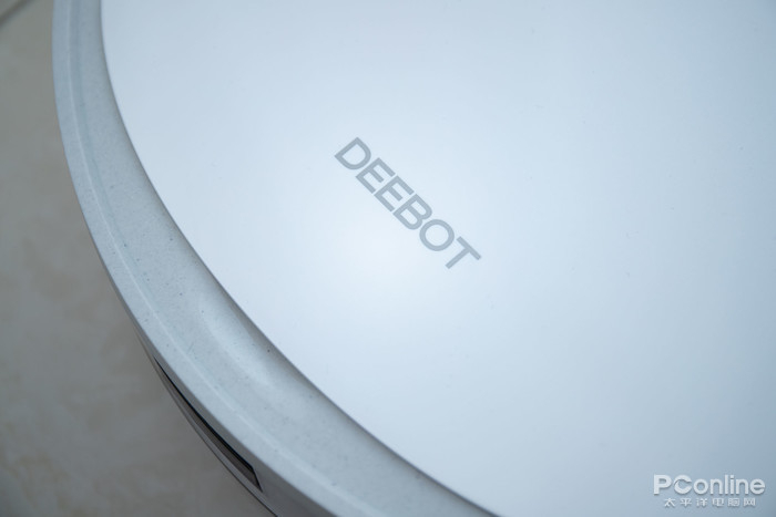 顶部有一实体按键控制扫地机的开关,按键旁有一小黑色方形区域是科沃斯DJ65的“视觉系统”,即摄像头,帮助扫地机定位和绘制清扫地图。和传统扫地机不同的是,这款扫地机的眼睛几乎内嵌在整理内,这也是为什么DJ65的厚度只有7.7cm的原因。