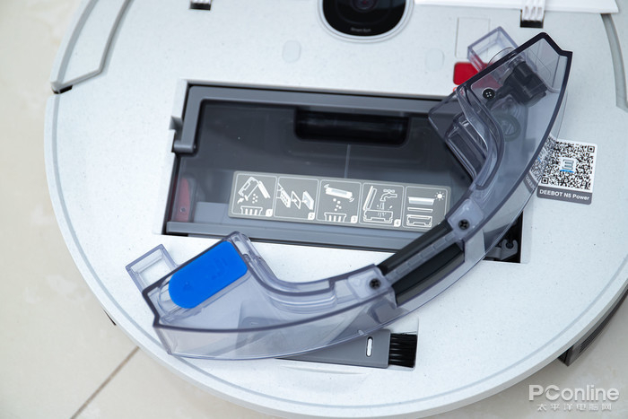 打开主机盖,和其它主流扫地机一样,尘盒内嵌在中央位置。尘盒上还有一“把手”方便提拉尘盒。