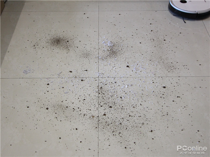 为了考验这款扫地机的实力,我们毫不留情地在地面上撒满奥利奥饼干粉末、纸片。从图片中可以看到,整个地面非常脏,相信一般家庭很少出现这样的情况。