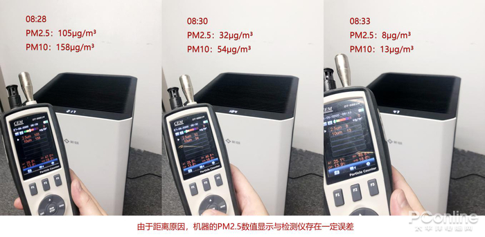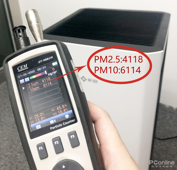 我们做了一个测试。在新颐小白3.0的1.5米左右点燃香烟。 用PM2.5检测仪进行取样检测,可以看到在08:24时,检测仪显示PM2.5到达了4118μg/m³。