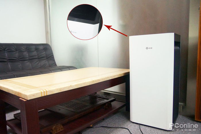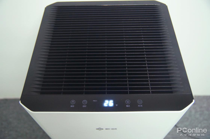 正面只有一个新颐LOGO,且是银灰色浮雕凸显,与顶部LED液晶触摸屏映衬,增加了机身的质感。顶部只有四个操作按键,开关、模式、童锁以及定时键,加上PM2.5与湿度显示,能实时监控室内空气质量。