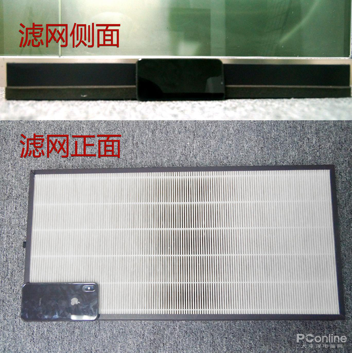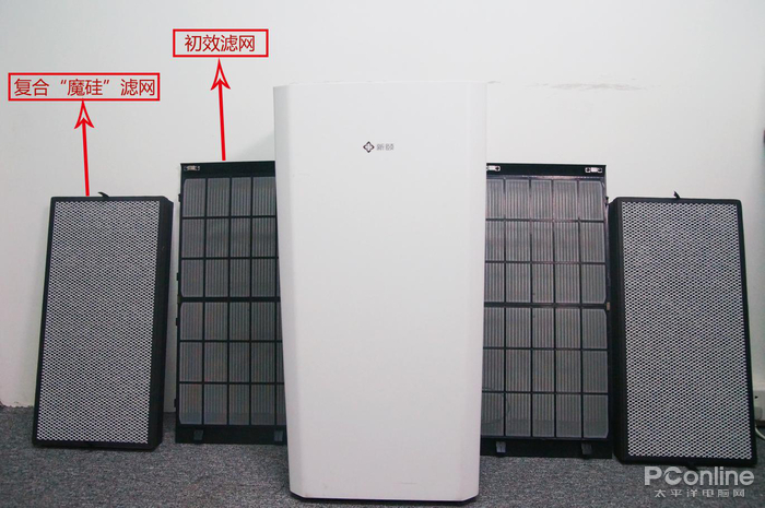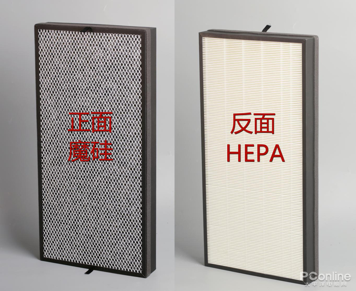 新颐小白3.0是采用双侧进风方式,滤网包括可清洗的初效滤网,和一个集成了HEPA和号称“魔硅”的大滤网,滤网手感很重。