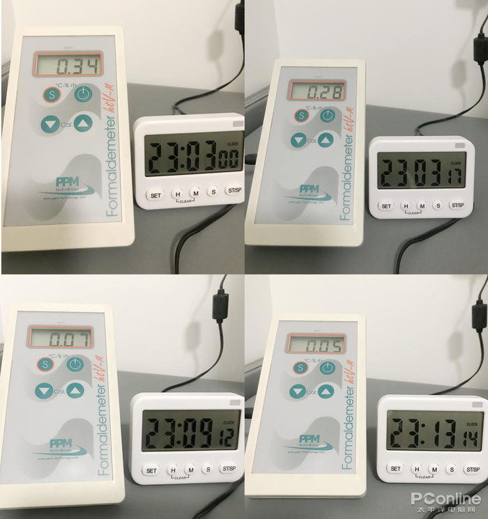 我们用实验室常用的甲醛直读仪PPM检测,密闭了近24小时后甲醛初始浓度高达0.34ppm,17秒之后就降低至0.28ppm,大约6分钟后就降低至0.07ppm(0.09mg/m³),10分钟后降低至0.05ppm,这证明在真实家居环境中,新颐小白3.0同样有效,且效果显著!