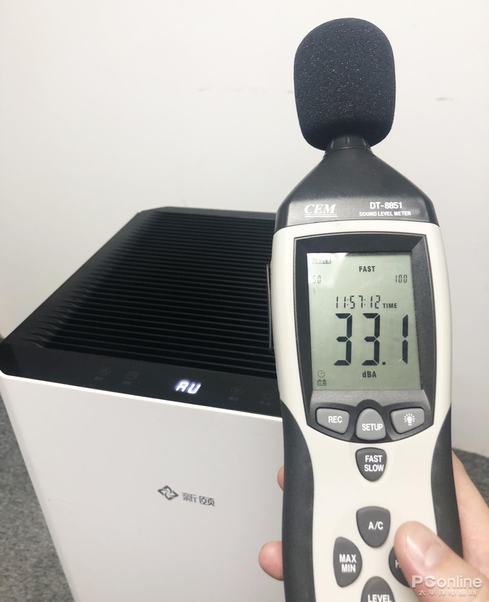 首先测试静音档,噪声测试仪显示新颐小白3.0有33.3分贝,我们是把耳朵贴到了出风口都几乎听不到声音,只有把手放到出风口才能感受有洁净的空气正在输出。