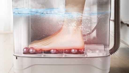 足部热浴是中国传统医学发汗疗术中行之有效的理疗、保健方法,当人体足部受到外部温度刺激时,可扩张足部血管,增高皮肤温度,加上足底反射区凸点按摩和磁力作用,推动气血津液循经上行,促进足部和全身的血液循环加速,驱散足底沉积物和消除体内的疲劳物质,确保血液循环顺畅和改善,从而调节各内分泌的机能,促使各内分泌体分泌各种激素。